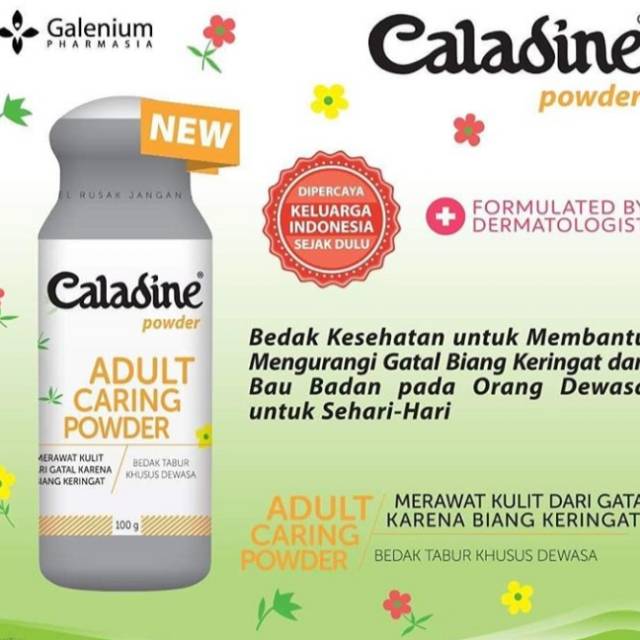 Caladine powder merupakan bedak tabur yang mengandung calamine yang berfungsi untuk mengatasi rasa gatal yang timbul akibat biang keringat. Caladine powder mengandung talk calamine zinc oxide fragrance camphox mentol. Biang keringat lebih mudah terjadi pada bayi. Saat mengalami biang keringat si kecil pasti merasa gatal panas serta muncul bintik bintik kemerahan di permukaan kulit.
