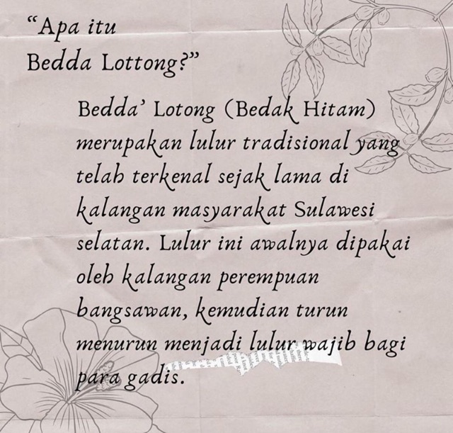 Lulur bedda lotong bedak hitam merupakan lulur tradisional yang telah terkenal sejak lama di kalangan masyarakat sulawesi selatan.