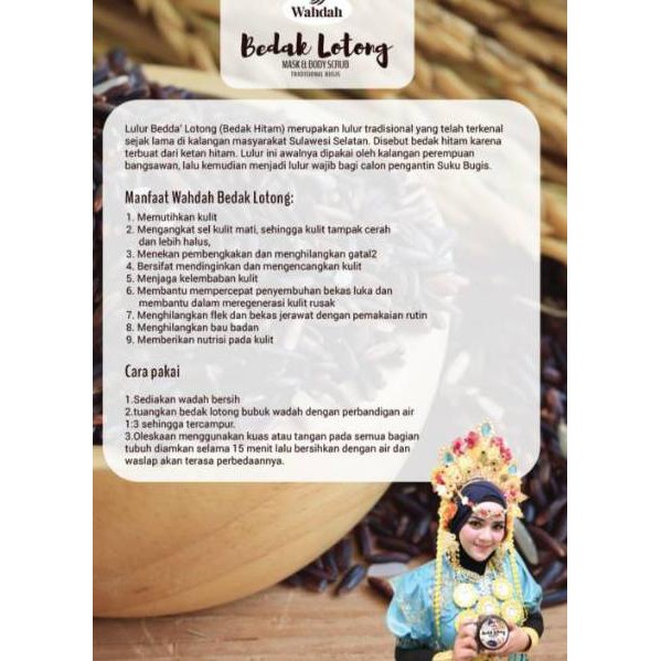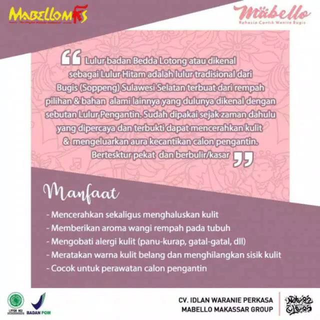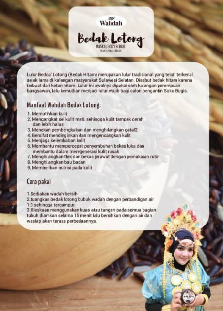 Seiring berjalannya waktu bedda lotong boleh dipakai semua wanita 1 hingga saat ini bedda lotong masih populer di kalangan wanita. Khasiat lulur bedda lotong sudah tidak diragukan lagi dalam merawat kecantikan kulit dan bisa digunakan segala jenis kulit baik itu pria atau pun wanita tua atau muda. Lulur bedda lotong bedak hitam adalah lulur tradisional ala bugis yang telah terkenal sejak lama di kalangan masyarakat sulawesi selatan. Aromanya yang alami juga dapat membuat fikiran menjadi rileks.