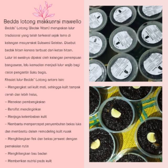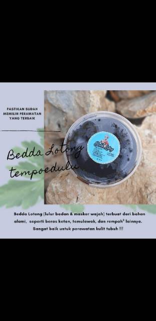 Bedak lotong terbuat dari. Bedda lotong ini terbuat dari berbagai macam bahan alami. Disebut bedak hitam karena terbuat dari ketan hitam. Bedda lotong sebenarnya hanya dipakai untuk calon pengantin yg akan melangsungkan pernikahan sebab dari dulu bedda lotong mabello dipercaya suku bugis dapat mengeluarkan aura dan aroma wangi pada si calon pengantin. Ya dibuat dari ketan hitam dan bahan lainnya yang kegunaan lulur hitam bikin kulit putih dan bikin bening mulus kinclong dambaan pria masa kini.