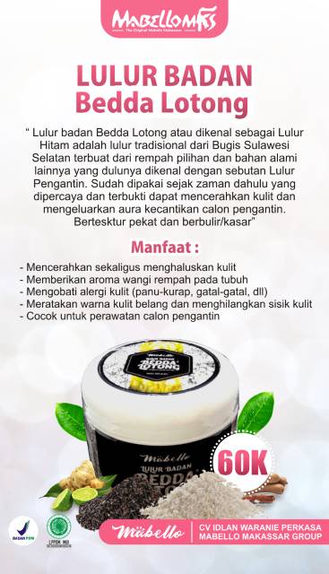 Mabello satu2nya bedda lotong lulur hitam mabello bersertifikat bpom dan halal mui beli 3 harga 55 000 pcs beli 6 harga 50 000 pcs beli 12 harga 45 000 pcs beli 20 harga 42 500 pcs beli 40 harga 40 000 pcs netto 300 gram kami adalah distributor resmi mabello di makassar. Bergabunglah dengan facebook untuk terhubung dengan bedak lotong dan orang lain yang mungkin anda kenal. Kali ini kami akan memberikan beberapa rekomendasi merk bedak yang bagus untuk memutihkan wajah anda dengan aman karena produk yang ini sudah memiliki nama dan mendapat izin dari bpom. 229 likes 3 talking about this.