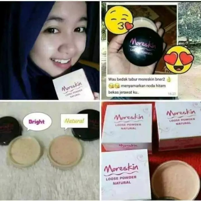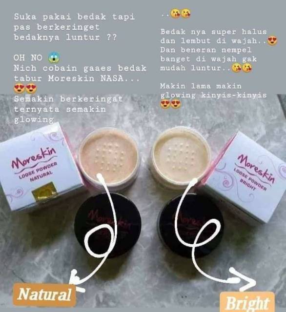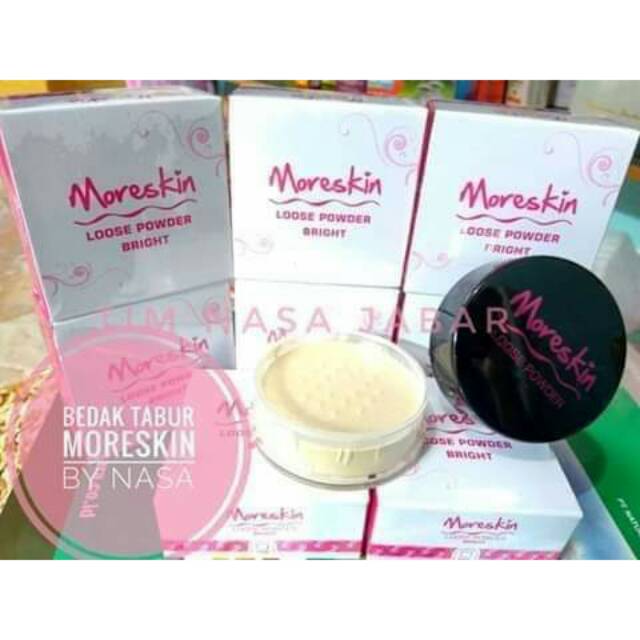 Moreskin loose powder bright yaitu bedak tabur halus dari paket kecantikan moreskin group dari pt natural nusantara nasa. Moreskin loose powder bright dan natural merupakan produk kosmetik kecantikan dari nasa berupa bedak tabur dengan tekstur halus dari moreskin group. Moreskin loose powder bright bedak tabur adalah salah satu produk dari nasa yang diperuntukkan khusus bagi wanita sebagai penunjang penampilan dan terbuat dari bahan bahan alami sehingga aman untuk digunakan sehari hari. Moreskin loose powder bright yaitu bedak tabur halus dari paket kecantikan moreskin group dari pt natural nusantara nasa.