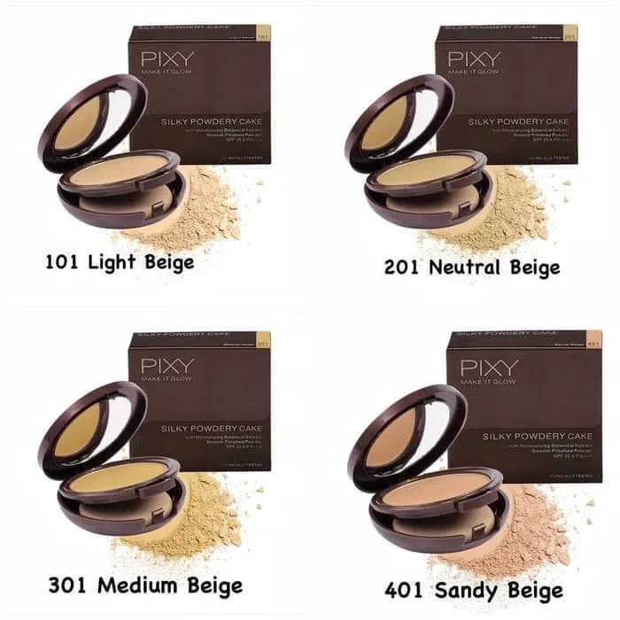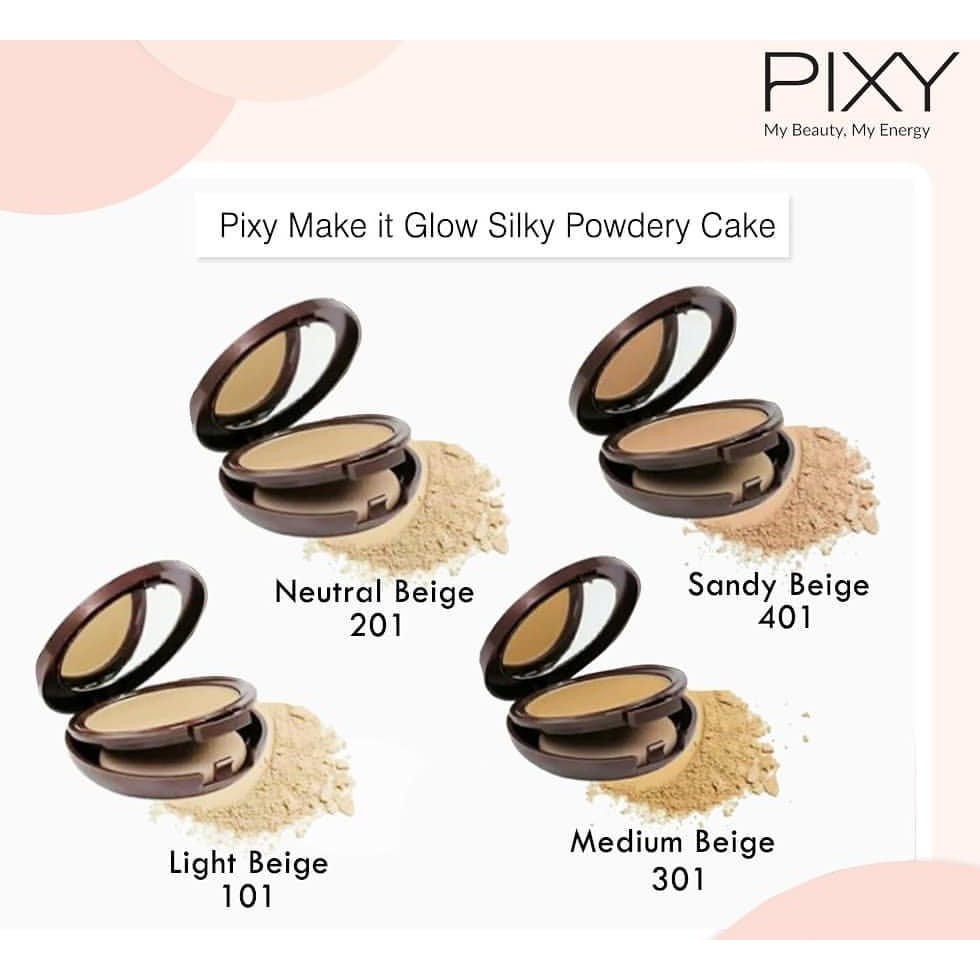 Kemasan box luarnya juga hadir dengan warna yang. Hasil make up terlihat lebih halus tampak alami dan bebas kilau. Bedak pixy make it glow silky powdery cake adalah bedak padat dengan formula two way cake yang teksturnya halus dan ringan dapat membuat kulit wajah tampak natural dengan hasil akhir kulit yang tampak halus bercahaya dan tahan lama. Butiran bedak yang halus dan soft focus effect membuat kekurangan di wajah kamu seperti flak hitam atau bekas jerawat tertutupi secara sempurna.
