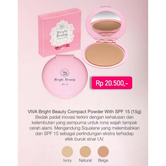 Viva bright beauty compact powder diperkaya dengan squalane yang melembabkan dan spf 15 sebagai perlindungan ekstra terhadap efek buruk sinar uv. Perlu anda ketahui bahwa harga bedak viva padat tetap menjadi andalan wanita indonesia karena terjangkau bagi seluruh kalangan terjangkaunya harga yang ditawarkan tetap mampu membayar beragam keunggulan dan manfaat dari produk viva tersebut. Nah berikut ini kalian bisa simak apa saja sih rekomendasi bedak padat yang kira kira bisa di coba dan cocok dengan kulit wajah berminyak kita. Teksturnya yang terkesan padat dan mampu menyerap pada sirkulasi kulit adalah salah satu kelebihan dan keunggulan yang di miliki oleh seri bedak viva kosmetik dimana serangkaian produk powder viva ini telah memiliki pula berbagai jenis serinya yang tentunya sudah di formulasikan sesuai dengan fungsi dan tingaktan kebutuhan konsumen saat ini terlebih lagi untuk kini sudah hadir juga seri.