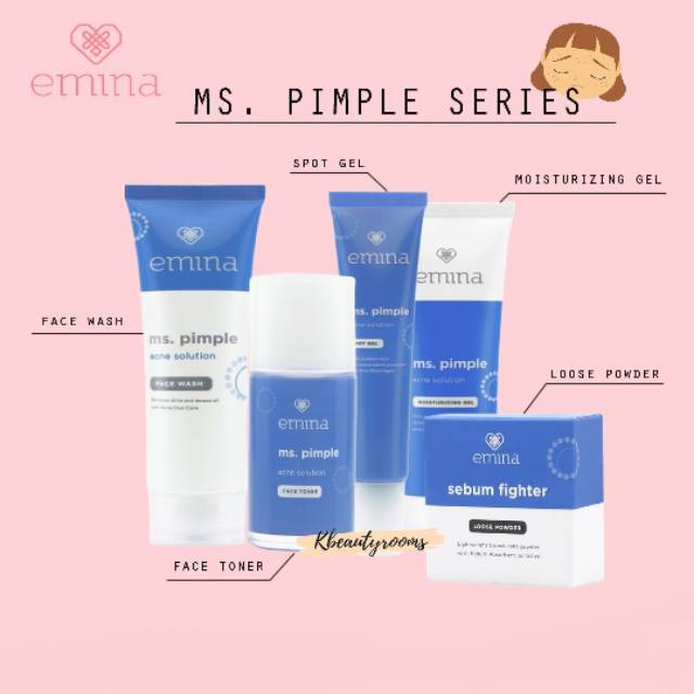 Emina ms pimple acne solution series memiliki kandungan salicylic acid membantu mempercepat regenerasi kulit dan mencegah pertumbuhan bakteri serta rosebay willowherb extract yang efektif mengurangi kemerahan pada kulit. Emina ms pimple acne solution series memiliki kandungan salicylic acid membantu mempercepat regenerasi kulit dan mencegah pertumbuhan bakteri serta rosebay willowherb extract yang efektif mengurangi kemerahan pada kulit. Emina ms pimple face wash adalah sabun pembersih wajah ringan yang diformulasikan untuk kulit berjerawat maupun kulit acne prone 2. Emina sebum fighter loose powder adalah bedak tabur yang mampu menyerap minyak berlebih pada wajah anda.