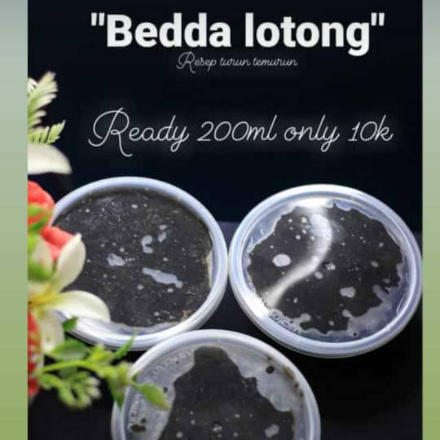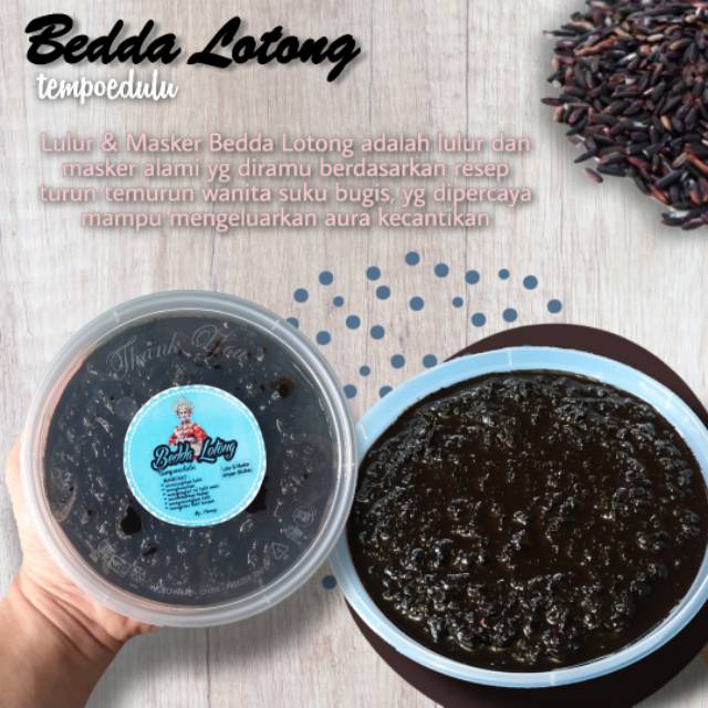 Bedda lotong berasal dari kata bugis yang berarti lulur hitam atau bedak hitam. Salah satu resep alami kecantikan khas nusantara adalah bedda lotong dari bugis. Apakah ingin melakukan perawatan kulit rambut kaki atau anggota badan lainnya. Untuk mengenalkan dan menjaga budaya dan warisan nenek moyang suku bugis bedda lotong kini diberi merk lebel serta telah dikemas menarik hingga dapat.