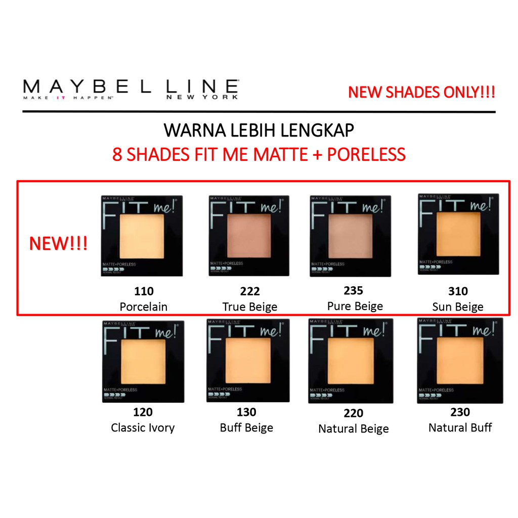 Warna bedak maybelline fit me matte. Bedak padat terbaru dari maybelline ini lebih bisa dijangkau oleh semua kalangan. Bedak maybelline fit me matte poreless diklaim mampu meratakan warna kulit untuk jenis kulit normal cenderung berminyak. Bedak ini berfungsi untuk meratakan warna kulit mengurangi kilap selama 12 jam lamanya serta hasil natural tanpa pori yang flawless. Nyokap aja yang awalnya ngga pernah mau pake foundation kalo pergi karena takut jerawatan dan gatel dan gerah katanya jadi minta terus setelah sekali coba pake.